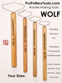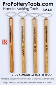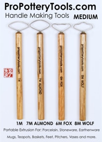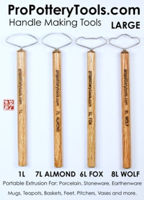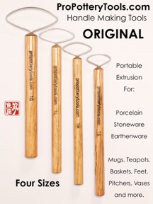 While in graduate school for clay, over 18 years ago, I started to develop the "original" pottery handle wire extrusion tool after seeing Tom Coleman demonstrate his version of what I discovered later was also like Leach’s.  You'll see a drawing of a similar tool in Bernard Leach's book. I tried many different types of metal including flat stock, sheet, round wire, annealed, cold formed, etc.